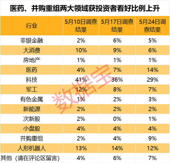 对于接下来潜力板块和方向选择,医药、并购重组两大领域获投资者看好比例持续上升,分别从5月10日的4%、2%提升至5月17日的7%、4%,进一步提升至最新调查的14%、9%。