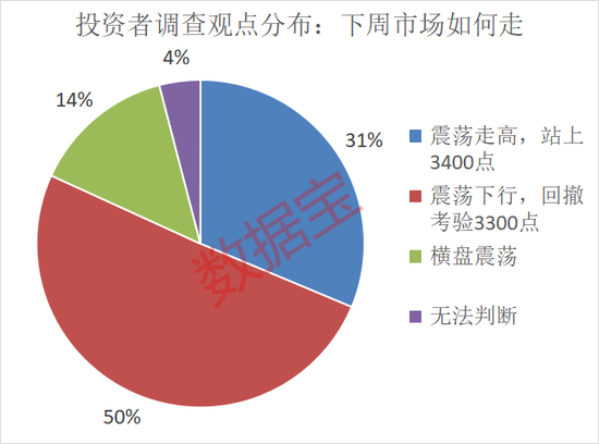 对于接下来一周的大盘走势,多数投资者认为大盘将“震荡下行,回撤考验3300点”,占比50%。认为“震荡走高,站上3400点”的观点比例为31%。