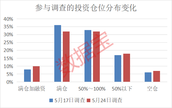 通过调查发现,本周较上期操作来看,“减仓”的比例有所上升,为24%,上升了3个百分点。“清仓”的受访者本期为10%,与上一期数据相比上升3个百分点。“持仓不动”的比例本期为43%,上一期数据为46%。“加仓”比例较上期小幅下降4个百分点至23%。